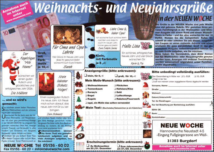 Überraschen Sie ihn doch, statt der üblichen Weihnachts- und Neujahrskarten, mit einer ganz persönlichen Anzeige in der NEUEN WOCHE! So vergessen Sie garantiert niemanden. Denn Ihre Anzeige erreicht Freunde und Verwandte in allen Dörfern und Ortsteilen von Burgdorf, Burgwedel, Lehrte, Sehnde und Uetze. Schreiben Sie uns einfach Ihren Text in die Textzeilen und wählen Sie Ihren Motivwunsch aus.